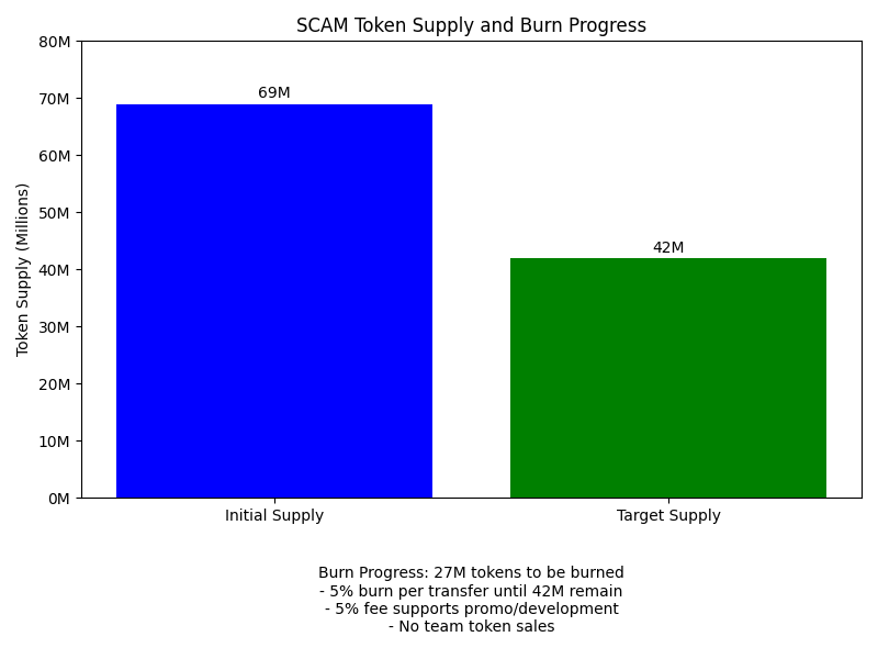 Initial supply: 69,000,000 SCAM. 5% burn per transfer until 42,000,000 tokens remain. 5% fee supports promo/development. No team token sales.